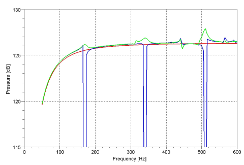 The pressure level on the sphere surface obtained at different frequencies. The exact solution (red) is compared with the numerical solution obtained with (green) and without (blue) the CHIEF technique.